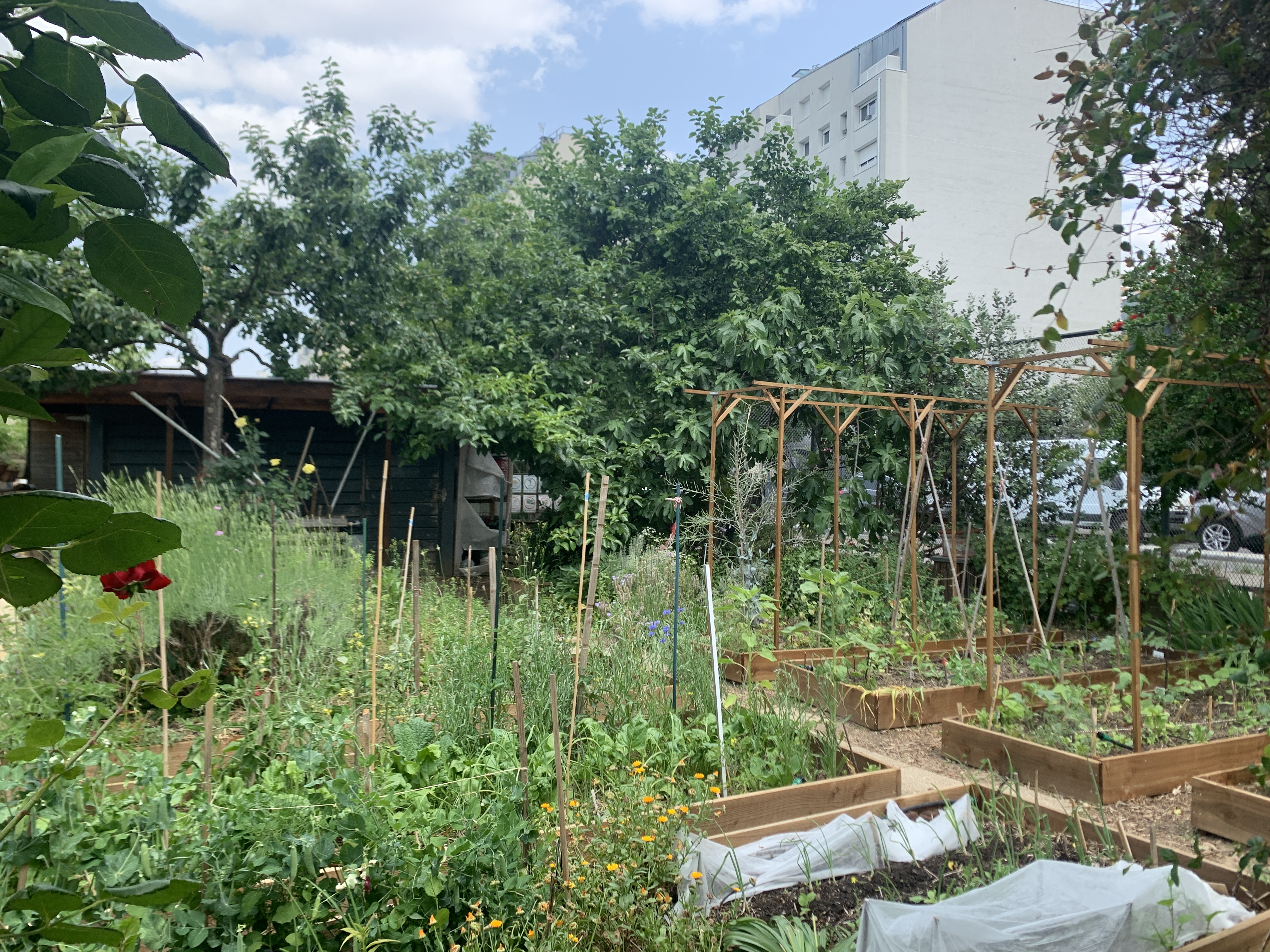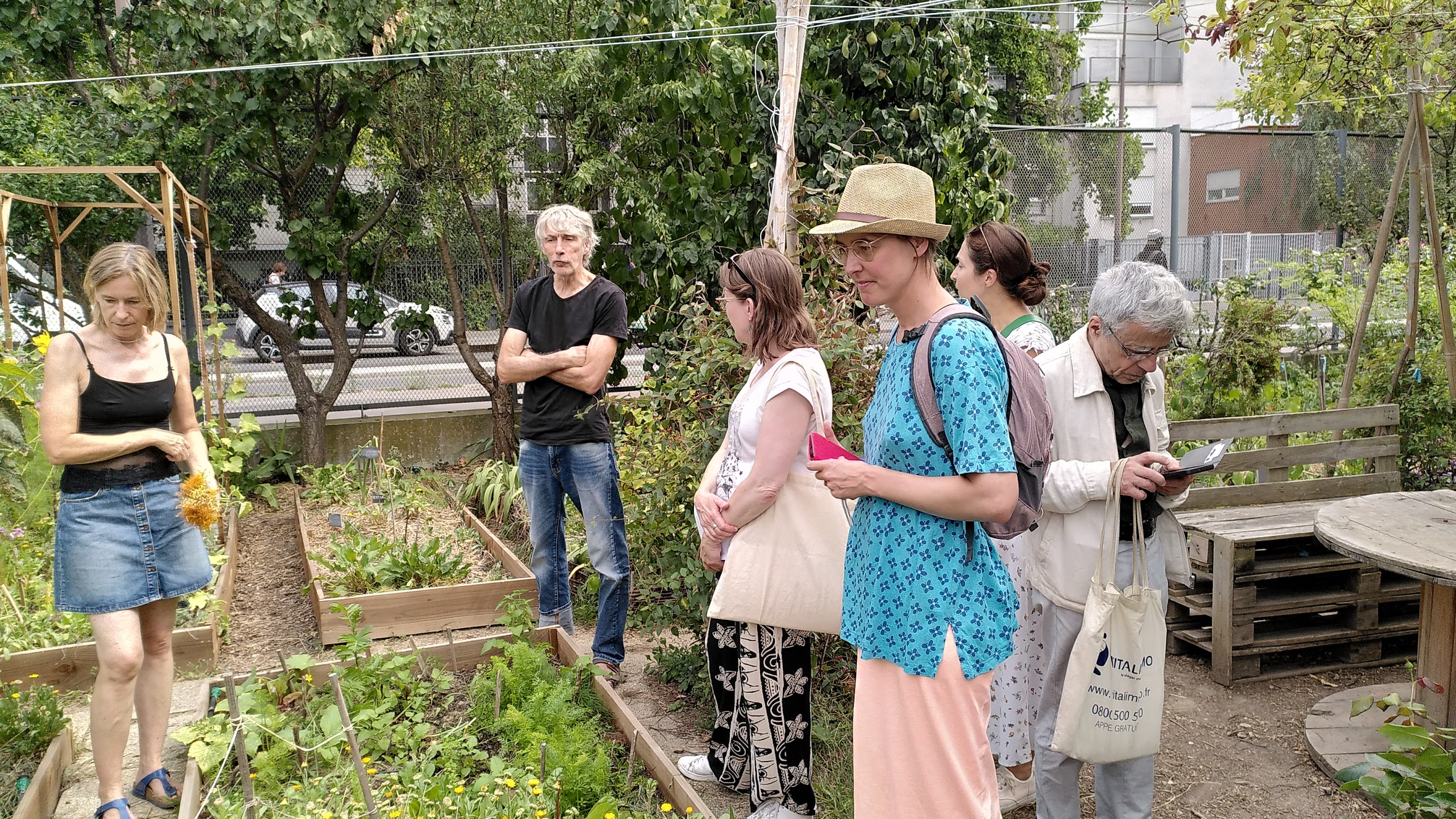 À y venir à plusieurs reprises, Éole semble "sectorisé". Au fond, près d’un mur tagué, des garçons développent leur musculature ; en haut, près de la buvette, des enfants s’amusent ; dans les hautes herbes, on attend le client, peut-être ; à l’entrée, lorsqu’il est ouvert, le jardin partagé accueille du public. Buvette fermée, c’est plutôt vers lui que nous nous tournons pour imaginer un instant de pause avec celles et ceux qui nous suivent.